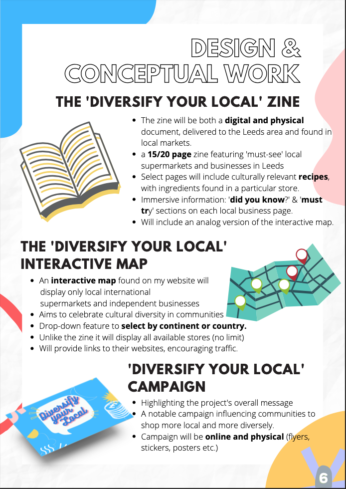 Diversify Your Local is a local-driven project which aims to enlighten the community of Leeds to the diverse selection of international and ethnic grocers on our doorstep.This enlightenment will come in the form of an digital map, enabling users to view all ethnic and oriental markets through an interactive drop down function to refine search by continent, country and culture. Aside from this mapping feature, Diversify Your Local will also be a physical and digital zine which will provide the community insight to these locations and what they have to offer.